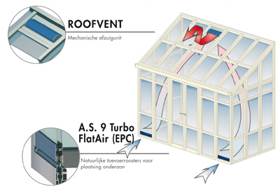De beste ventilatie verkrijgt u wanneer de Roofvent, een mechanische afzuigunit, geplaatst wordt in combinatie met een vlak natuurlijk ventilatierooster zoals FlatAir (EPC) of A.S. 9 Turbo. Dit concept zorgt voor een optimale comfortbeheersing van uw veranda of serre.